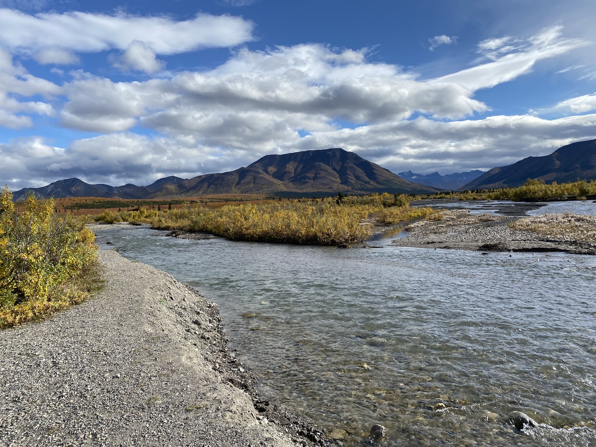 The landscape of Alaska is absolutely beautiful. We were able to stop and get out multiple times along our highway journey to take pictures and soak it all in. The leaves are all changing colors for fall. We made it to Denali in good time and were able to get Dad’s LIFETIME National Park pass and check out the gift shop. We then decided to go on a small hike to say we explored just a little of Denali. Denali has one main road and you can only go 15 miles on it in your private vehicle. To go any further you must buy a bus ticket. We didn’t have time for the bus, so we went to mile marker 13 to enjoy the Mountain Vista Trail. It butted up against the Savage River. The drive was beautiful, the river was beautiful, the mountains were beautiful. Truly, just breathtaking.
